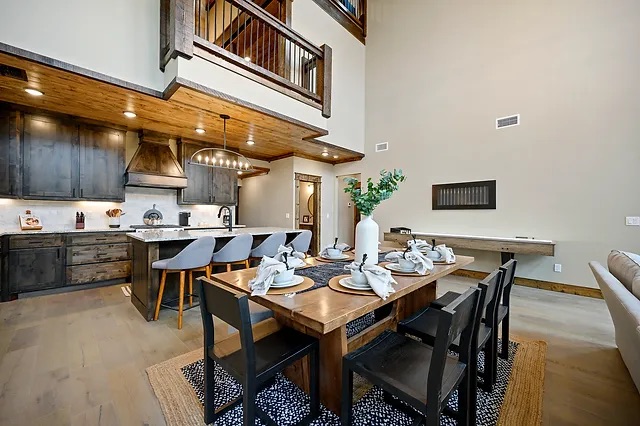 The Lookout at Pine Lake: This beautiful cabin sleeps 11-13 & offers three separate bedrooms plus a loft. The Lookout has a King suite with en-suite bath on the 1st floor along with a shuffleboard table and 1/2 bath. Under the stairs is The Lookout Cafe Pizzaria & playroom with another twin bed for a kiddo to sleep. Connect to wifi or watch plus cable TV on one of the 6 TVs in the cabin.